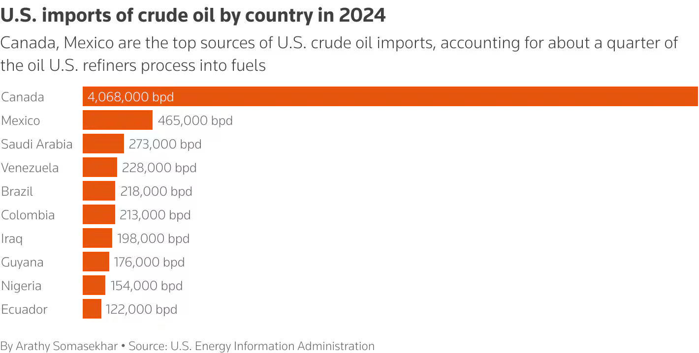 Much of Venezuela’s oil historically went to refineries along the U.S. Gulf Coast in Texas and Louisiana, facilities specifically designed to process heavy crude. When U.S. sanctions effectively shut down Venezuelan exports over the past decade, Canadian producers filled the void. Canada now supplies approximately 60% of all U.S. crude imports, roughly nine times more than the next biggest supplier, Mexico.