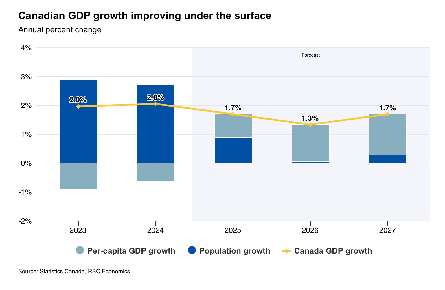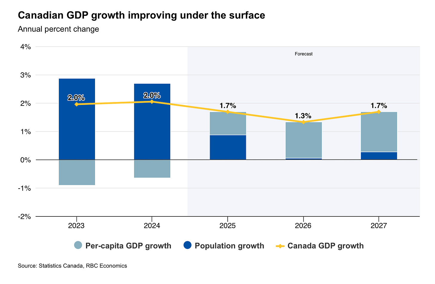 Economists expect GDP growth of 1% to 1.5%, below trend but not recessionary. They expect inflation at 2%, wage growth at 3%, gradually declining unemployment, and stable interest rates. These are reasonable baseline assumptions, but the confidence intervals around them are wider than usual. Small changes in U.S. trade policy, immigration rules, or global economic conditions could push Canada significantly above or below that baseline.