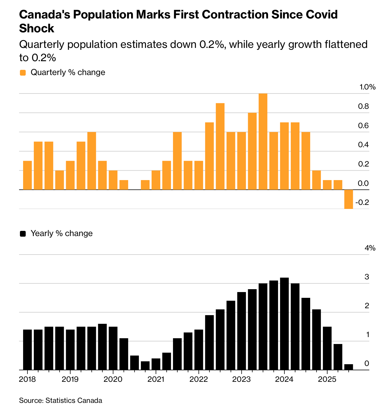 Canada’s population declined 0.2% in the third quarter of last year, dropping to 41.6 million people. This marks the first such decrease in recent memory for a country that built its modern identity on immigration and population growth. The decline isn’t primarily about birth rates, though Canada’s fertility rate has fallen below 1.3 children per woman. It’s about a dramatic reversal in immigration policy.