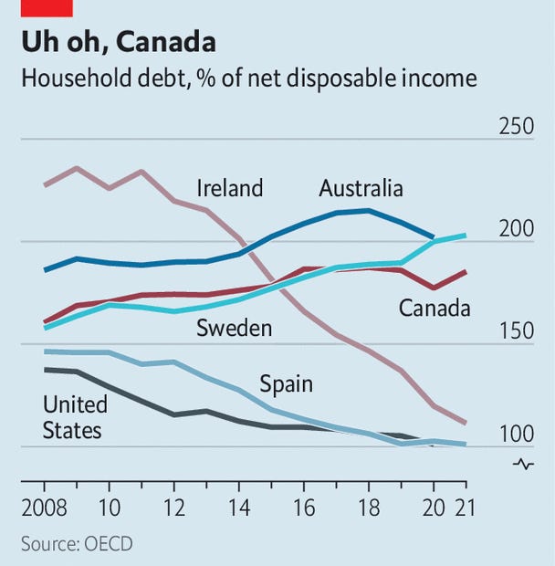 The consequences of inelastic supply extend beyond prices to household balance sheets. Canadian households now owe roughly $1.75-$1.80 for every dollar of disposable income—the highest in the G7 by a significant margin. Household debt represents 98-100% of Canada’s entire GDP, compared to about 75% in the U.S. and lower levels in other G7 nations.