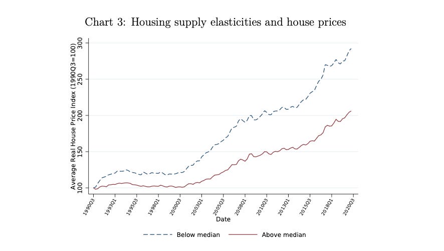 But this median masks dramatic variation. In Vancouver, that same 1% price increase generates far less supply response because of the structural constraints: zoning, geography, regulatory barriers, and construction capacity limits. This means that in inelastic cities, the normal market mechanism is broken. Prices can rise 50%, 100%, even 200%, and supply still can’t catch up. Each price increase generates some supply response, but never enough to close the gap. The market remains perpetually out of equilibrium, with prices climbing ever higher while supply lags further behind.